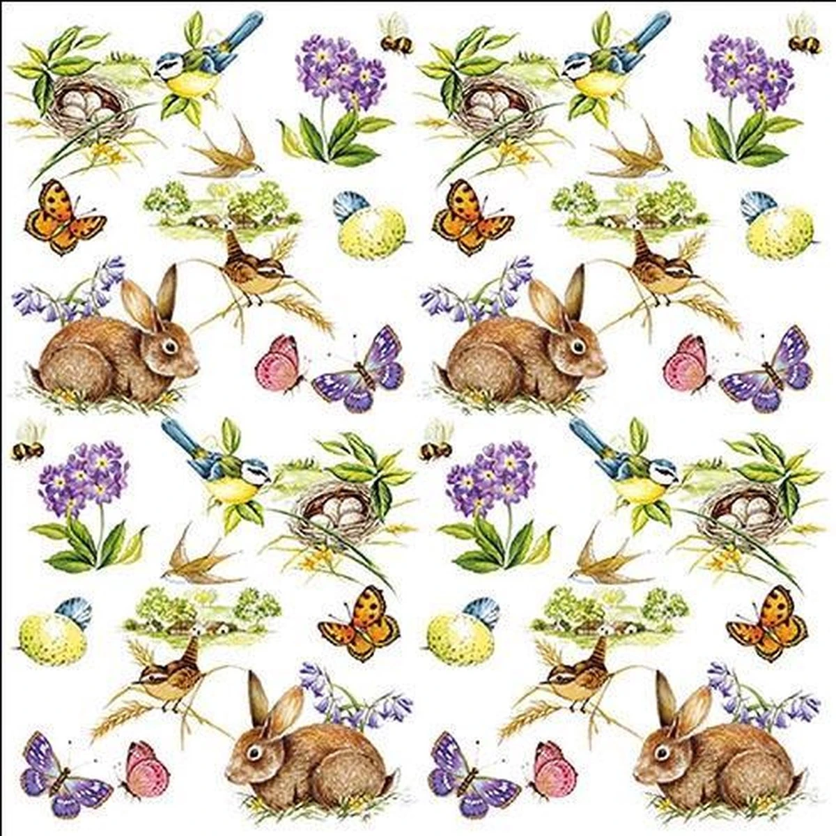 Op deze servetten is te zien: Konijntjes, bloemen, vogels, eieren en vlinders