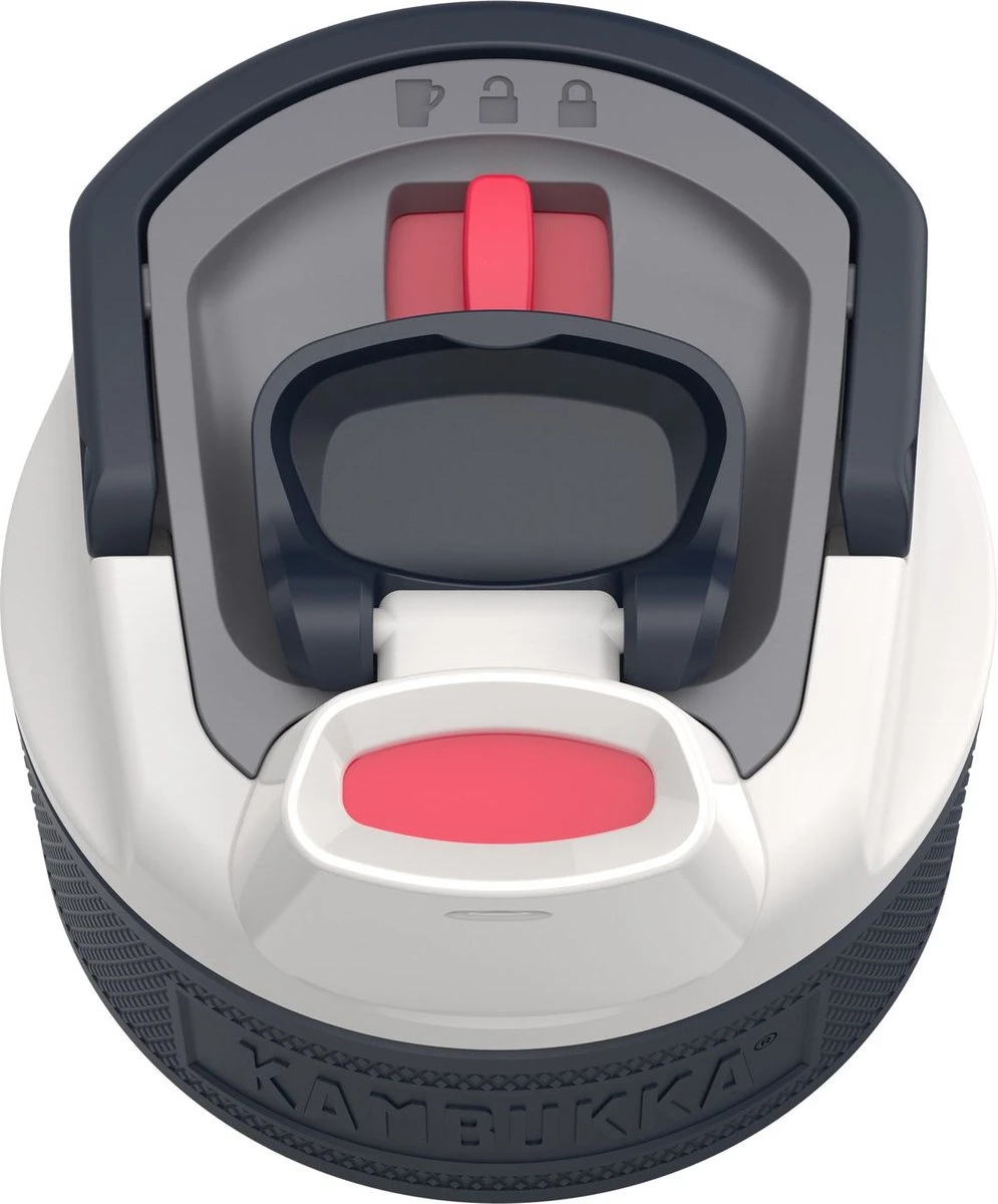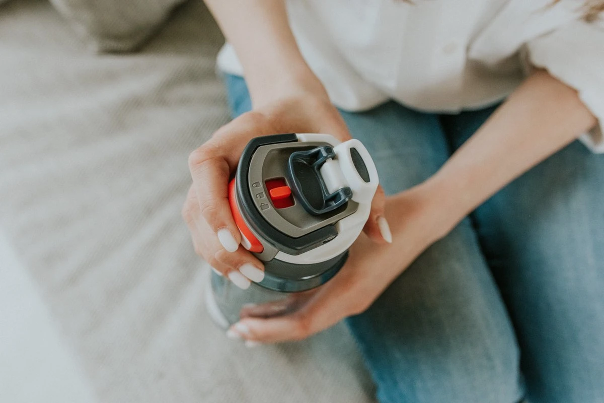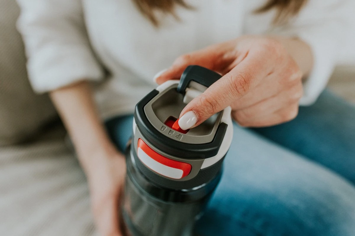 1: Druk’-positie: druk op de knop van onze drinkfles om een slok te nemen. Nooit meer morsen terwijl je haast naar de volgende meeting of al rennend je trein probeert te halen.