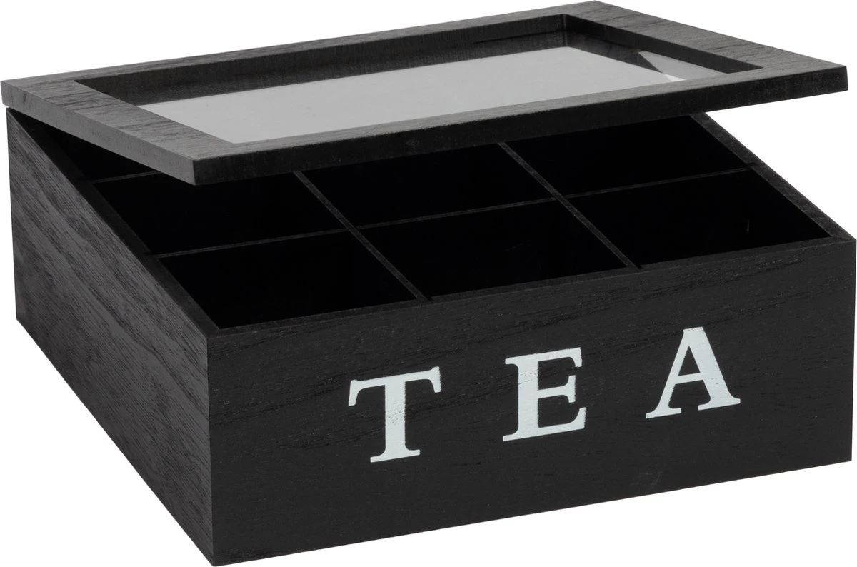 Theekist – Zwart – Hout 9-Vaks – Glazen Deksel – Theedoos