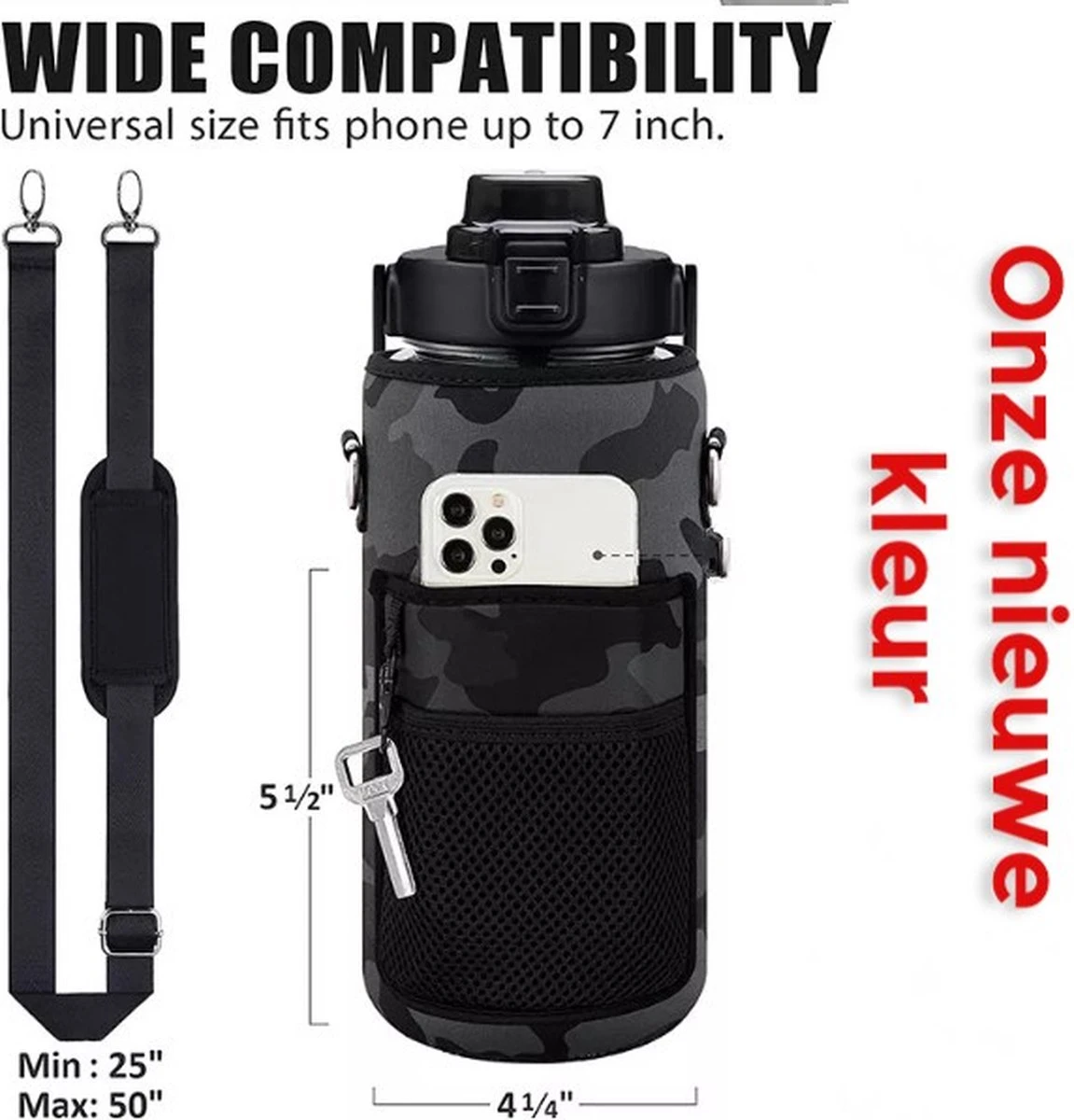 Onze 2 liter drinkfles met bijpassende sleeve en motivatie armband! Neem je drinken nu nog makkelijker overal mee naar toe samen met je allerbelangrijkste items.