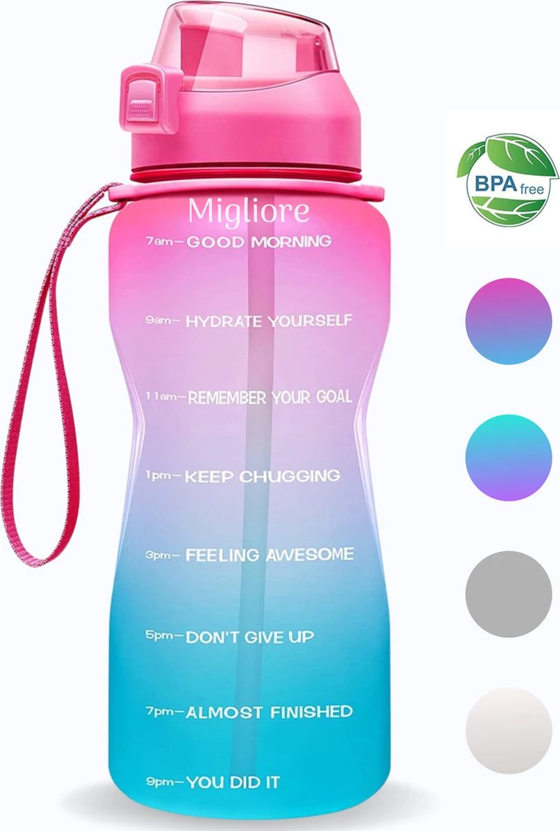 Deze Drinkfles van Migliore is ideaal om genoeg vocht binnen te krijgen. Door het handige rietje en de mooie kleuren zult u de fles overal mee naartoe willen nemen. De drinkfles beschikt over een draagriem waardoor hij gemakkelijk mee te nemen is, ook zit er een handig slot op waardoor de fles niet kan gaan lekken. Kies ook voor de Drinkfles van Migliore en drink door de tijd markeringen en aanmoedigingsteksten elke dag genoeg water.